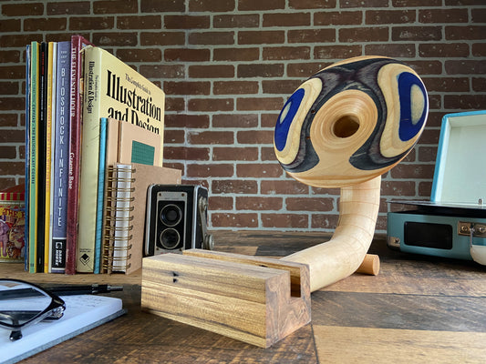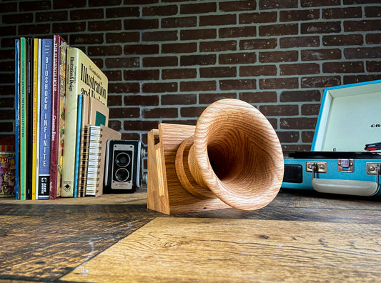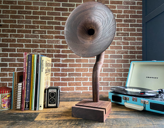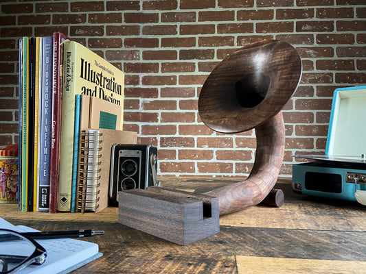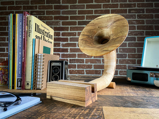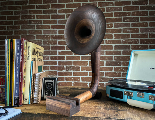 -The Gramophones are designed to be completely hollow on the inside, similar to the gramophones of old. So when you place your device onto the base, the speaker of the device plays into the amplication hole in the base and projects out through the gramophone horn, giving your music that nice vintage gramophone sound!