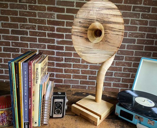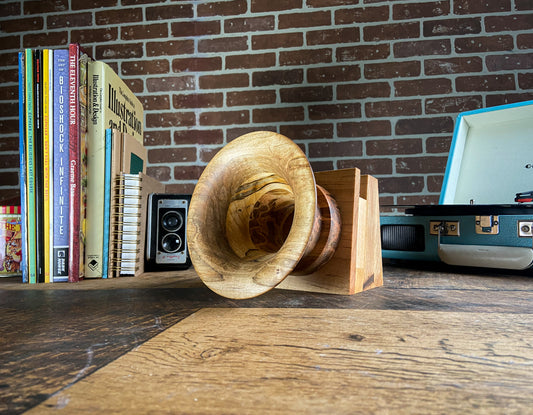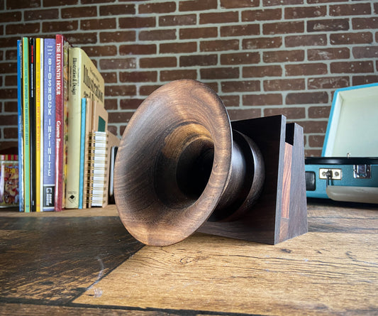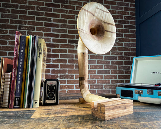 However it wasn’t until I was on the search for a gramophone when that all changed. Being an old soul at hear, I always had a fascination with gramophones. Both their look and the sound they make was something that always appealed to me and I was determined to find one for our new family home. But as I began looking, I realized that the majority of gramophone either have to be cranked, only play records, or both, and I was hoping to find a way to retrofit one to use my phone with. And that’s when the light bulb went off! I thought, your a woodworker, why not try to build one? And so that’s what I did!